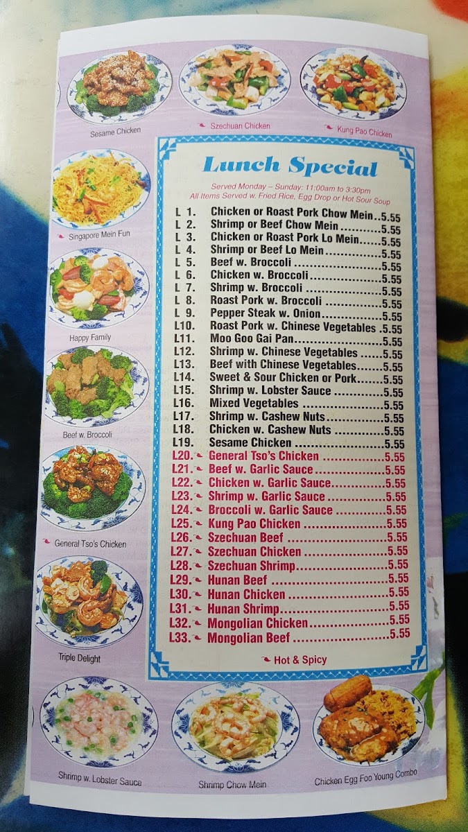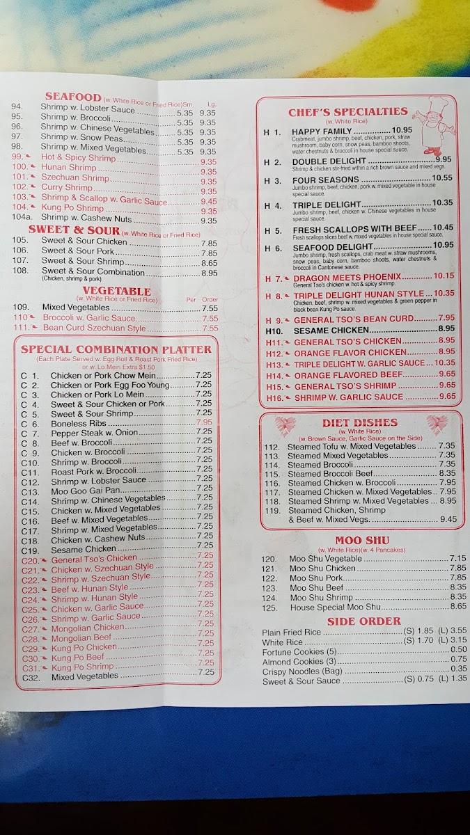 Alongside main dishes, options like Moo Shu Pork and House Special Moo Shu provide a slightly more traditional touch to the lineup, inviting diners to explore a bit more of the menu. The choice of rice—fried or white—helps customize each dish to your preference, adding to the approachable nature of the dining experience.
